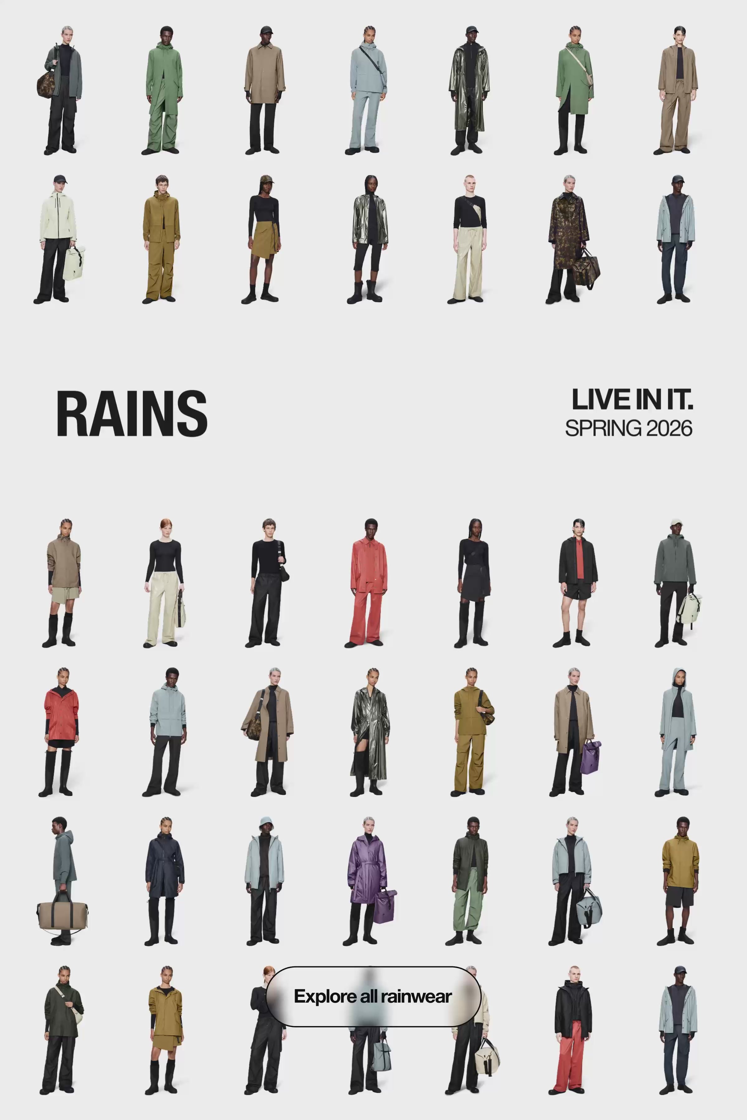 Rains a lancé une collection complète de vêtements, sacs et accessoires imperméables. Aujourd'hui, chacune des collections reprend le même esprit en offrant un mélange de modèles de vêtements de pluie remis au goût du jour et des solutions de vêtements de pluie originales, uniquement disponibles chez Rains.