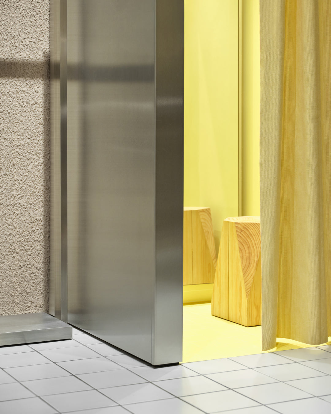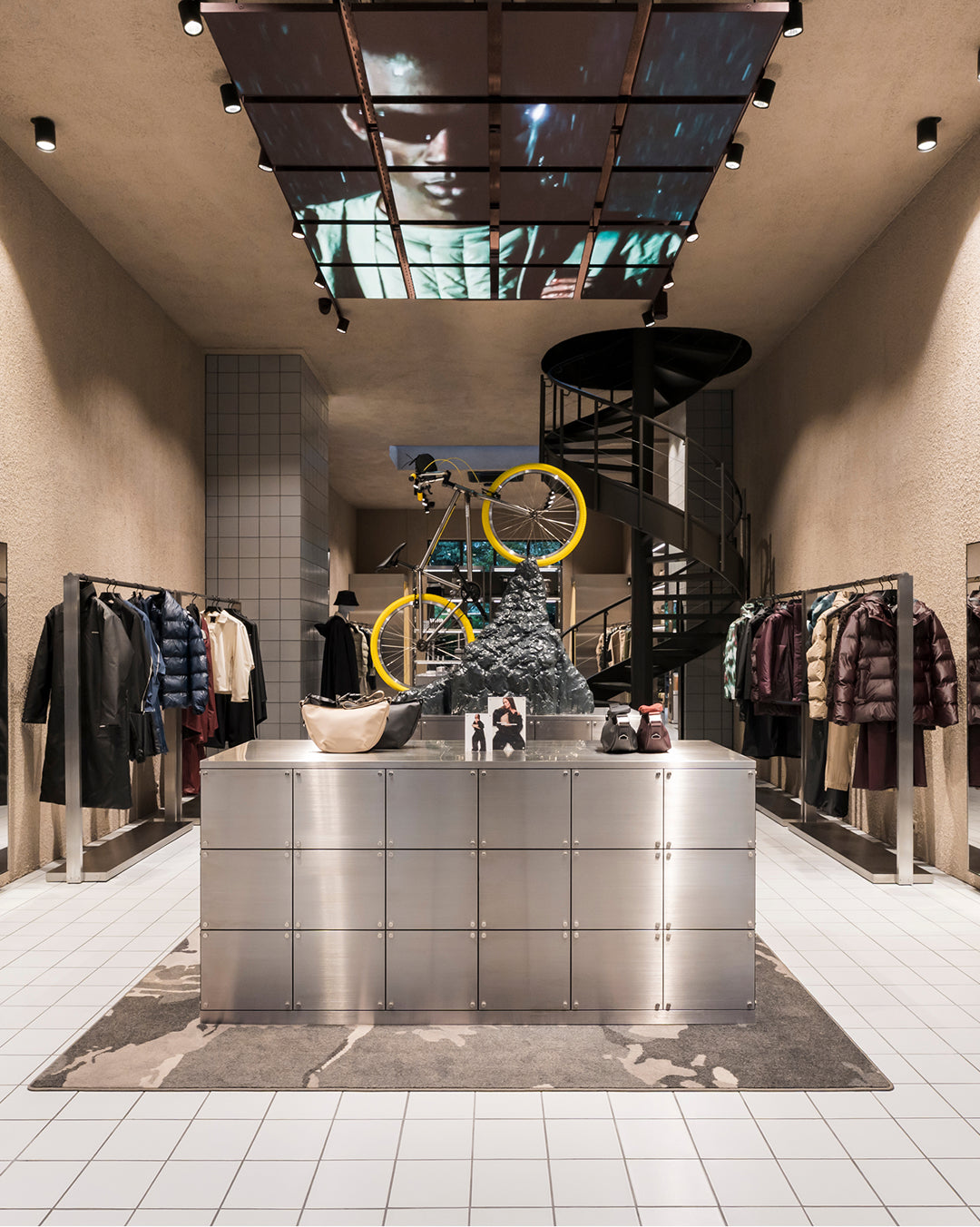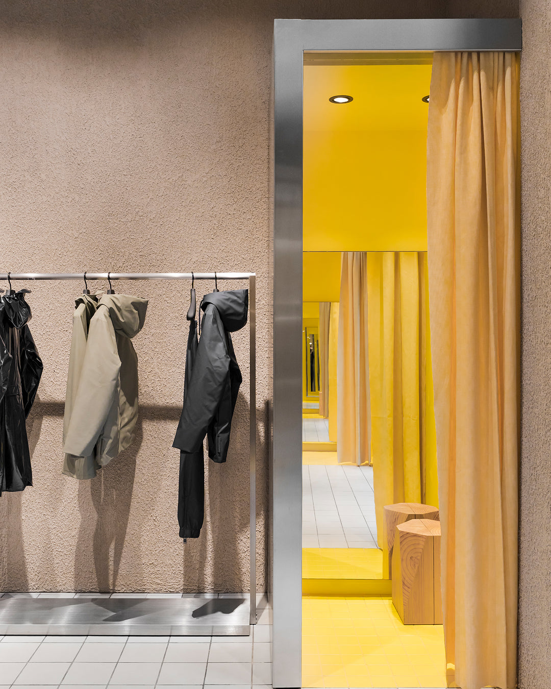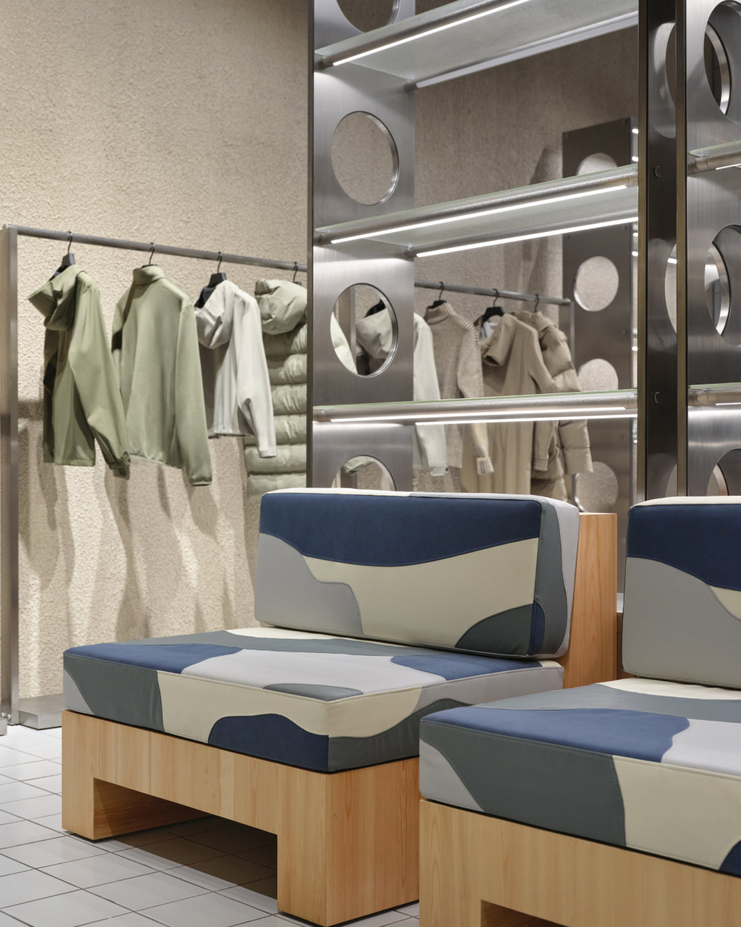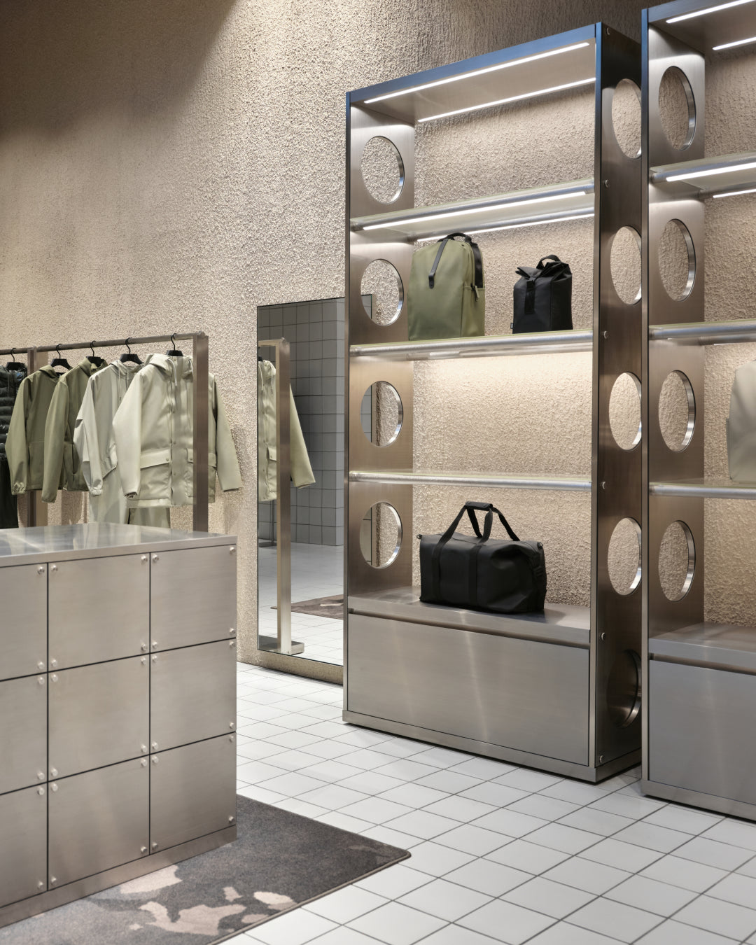 It introduces a whole new look and feel for Rains stores—with a warm, welcoming palette, bespoke furniture, and a balance between futuristic references and the softness of nature.