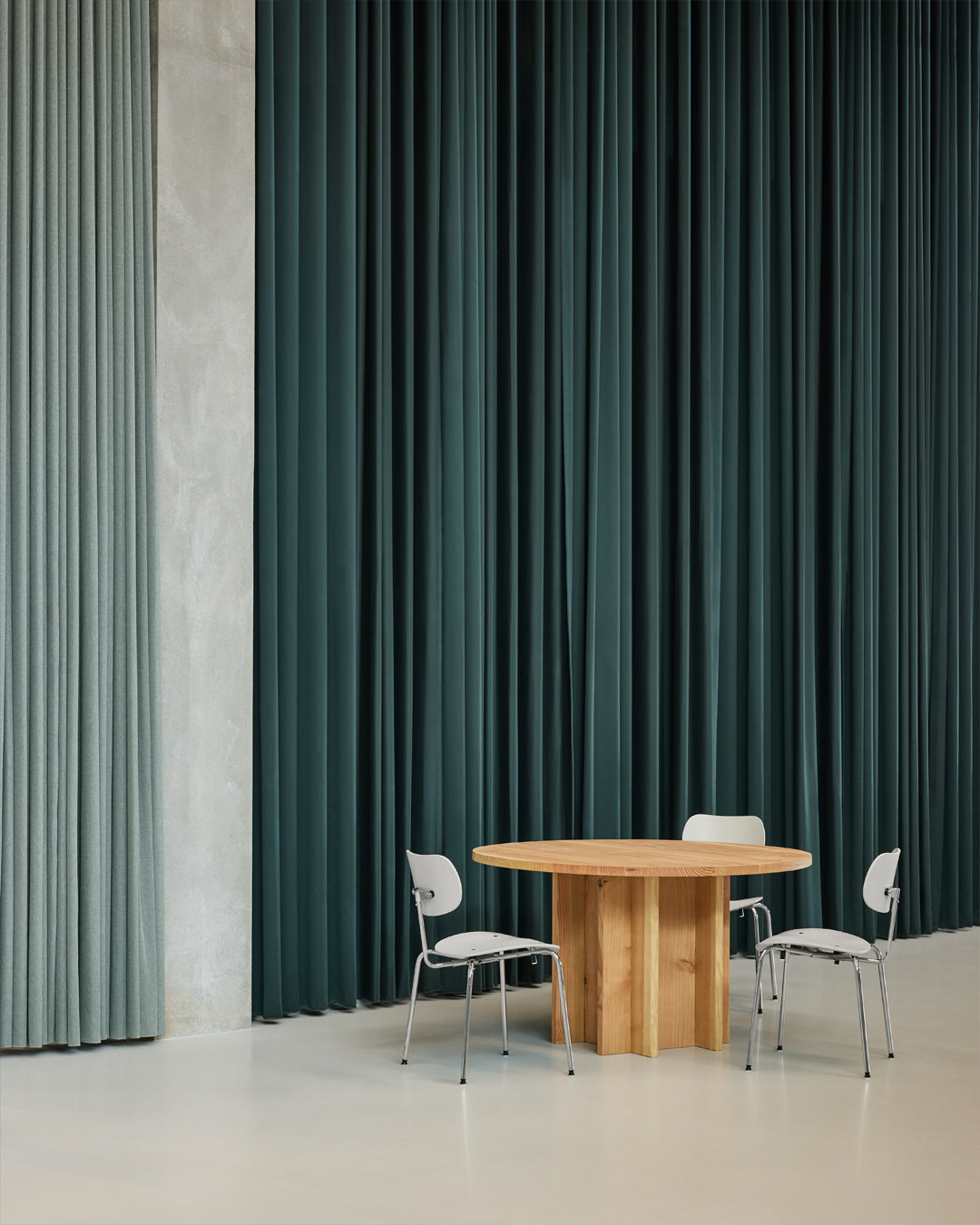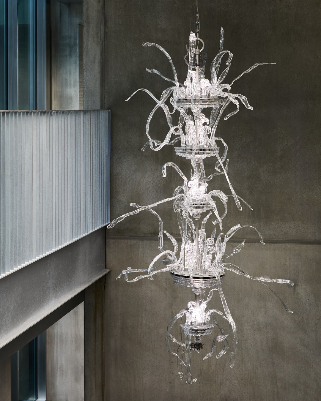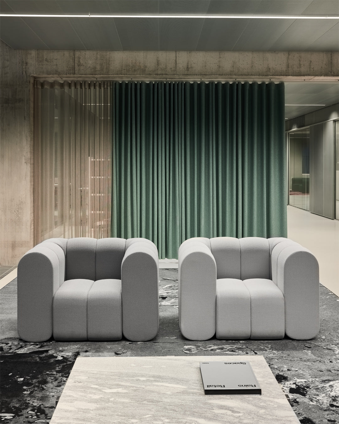 Behind the minimalism, there’s warmth in the details. The building is coated in a serene grey pantone. A simple backdrop for the brighter soft furnishings and budding art collection within. Hanging impressively over the HQ's entrance is one example of this collection: a glass chandelier by local artist Alexander Kirkeby. Elsewhere, custom rugs have been placed on every floor, each representing abstract weather patterns. A nod to purpose.